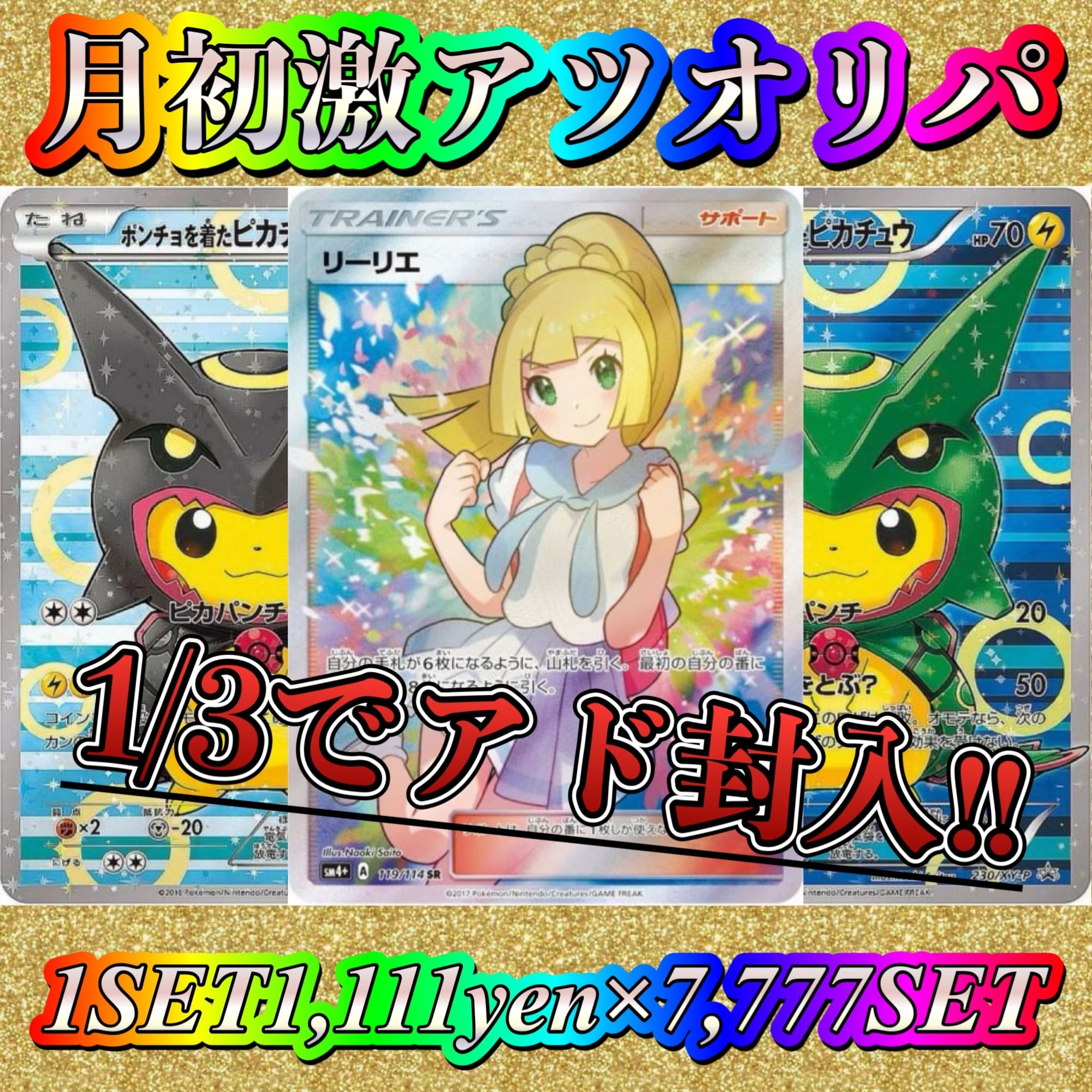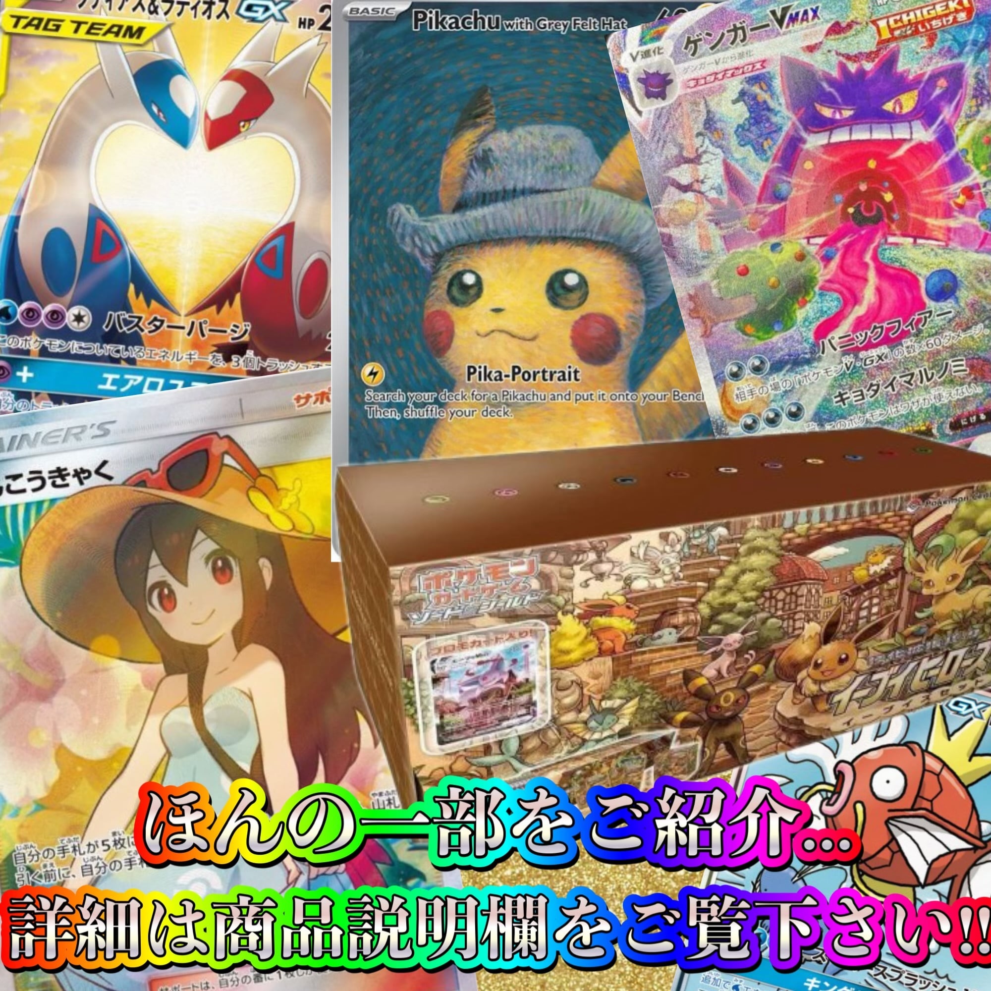 がんばリーリエ、ポンチョを着たピカチュウ、ポンチョを着たピカチュウ、ゲンガーVMAX、ラティラティ、コイキング&ホエルオー、メガリザードン、ゴッホピカチュウ、かんこうきゃく、レックウザV、エリカのおもてなし、ルギアV、マリィ、ゲンガーVMAX、リーリエのピッピex、ピカチュウex、ブラッキーV、ミュウexなどなど